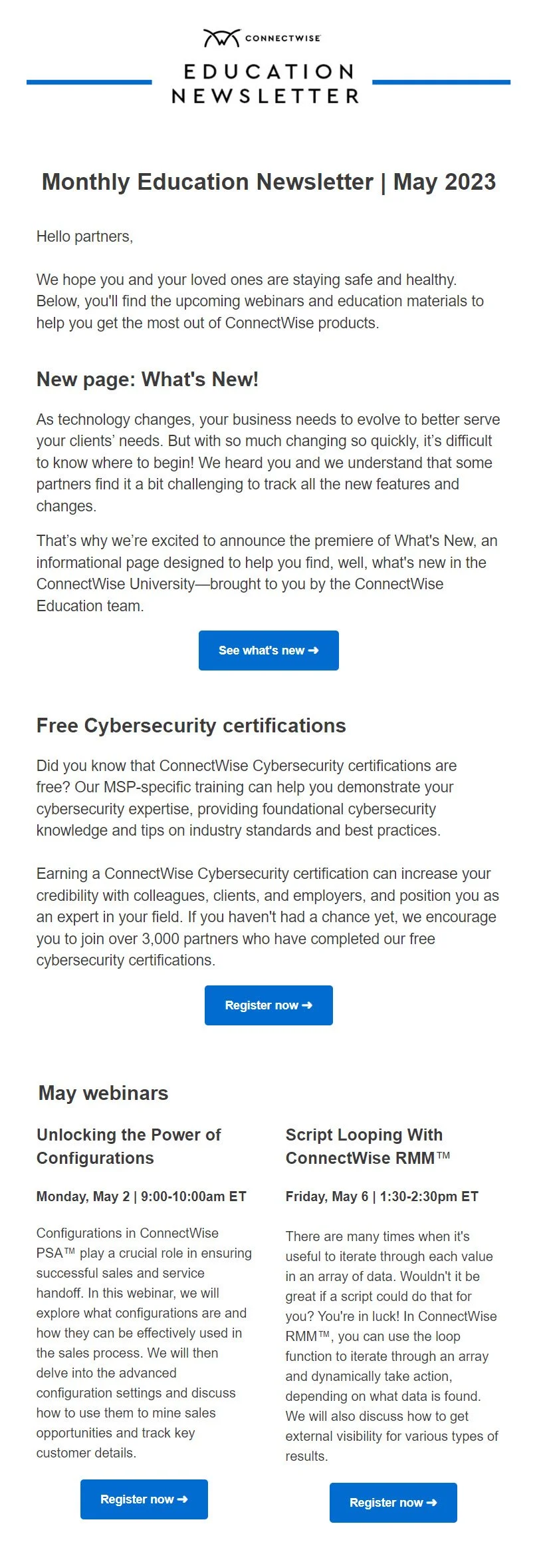 Each month, the Education newsletter promotes company announcements, product updates, new educational assets, and events to ConnectWise partners. I collect updates from departments throughout the company and communicate them to our partners through this newsletter. I collaborate with the Marketing and Partner Communications teams to strategize an effective communications plan to drive traffic to our content and services.