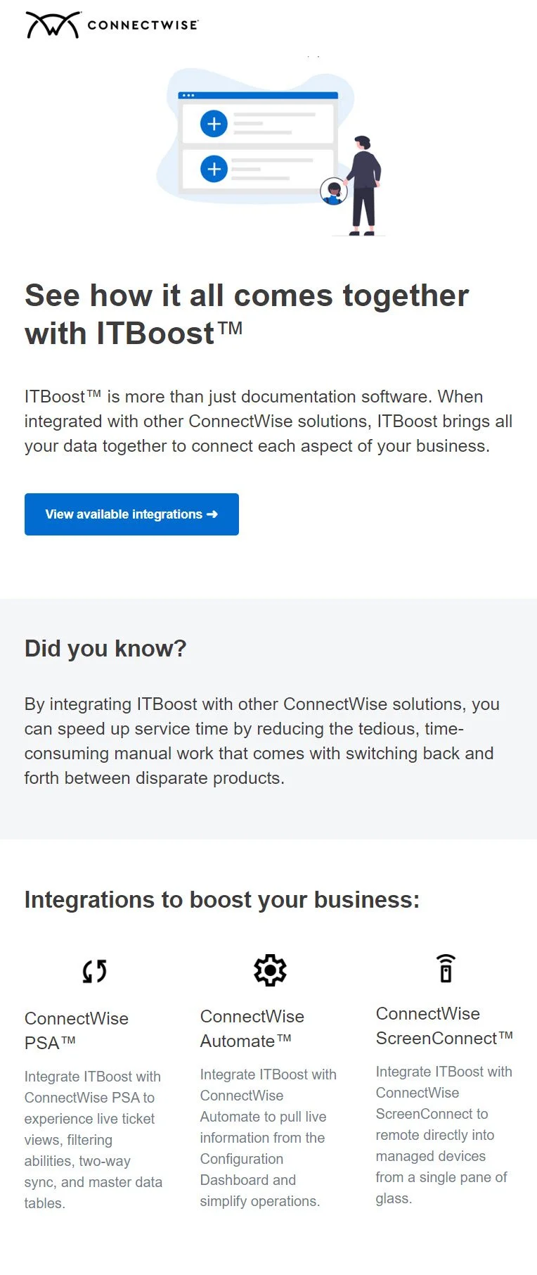 I wrote marketing copy for this email to advertise ConnectWise solutions and display the benefits of integrating ITBoost with other ConnectWise products.
